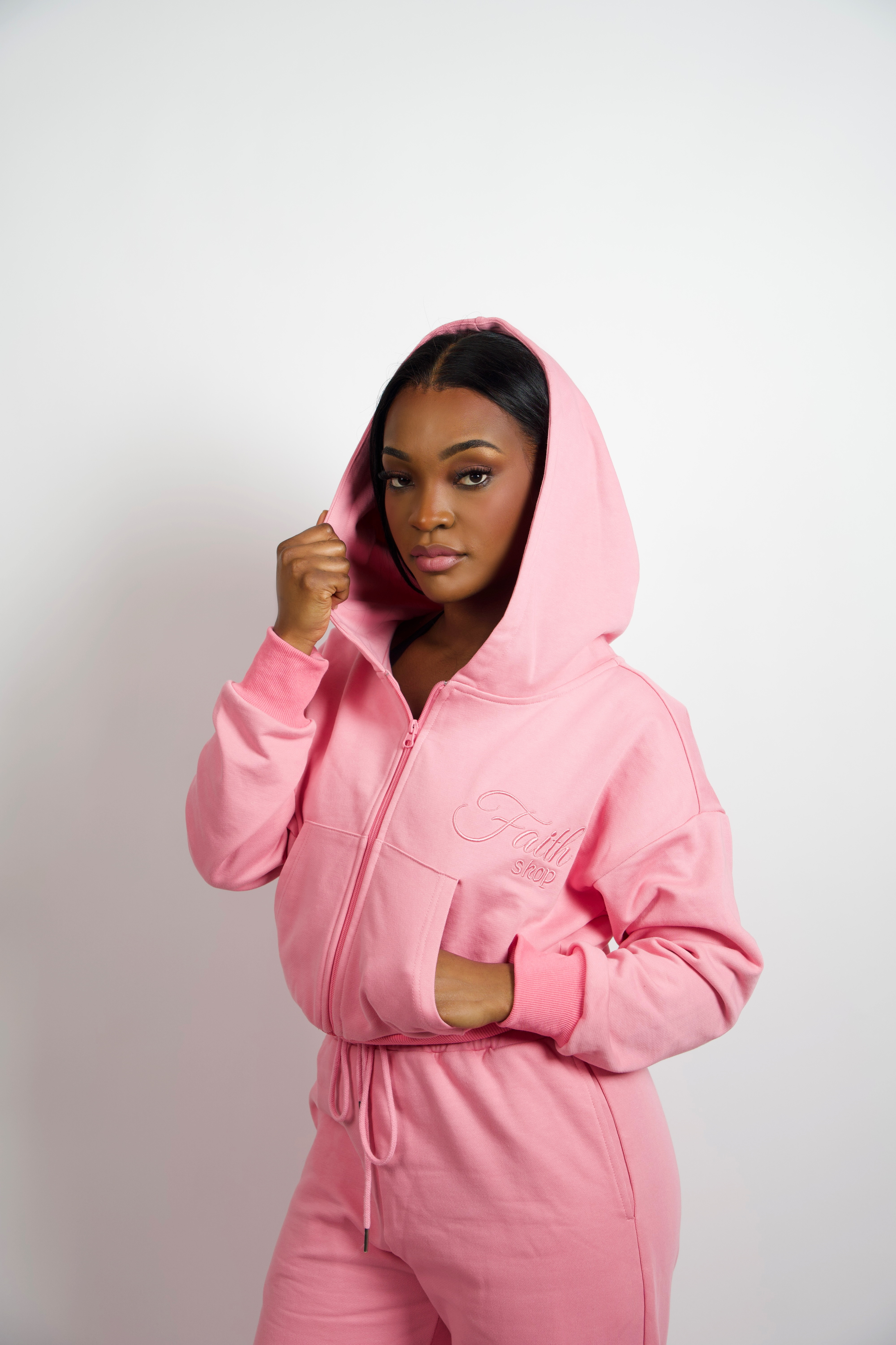 Sweat zippé à capuche avec broderie ton-sur-ton « Faith-shop » sur le pectoral. Inscription « small girl with a big god » en strass au dos.
