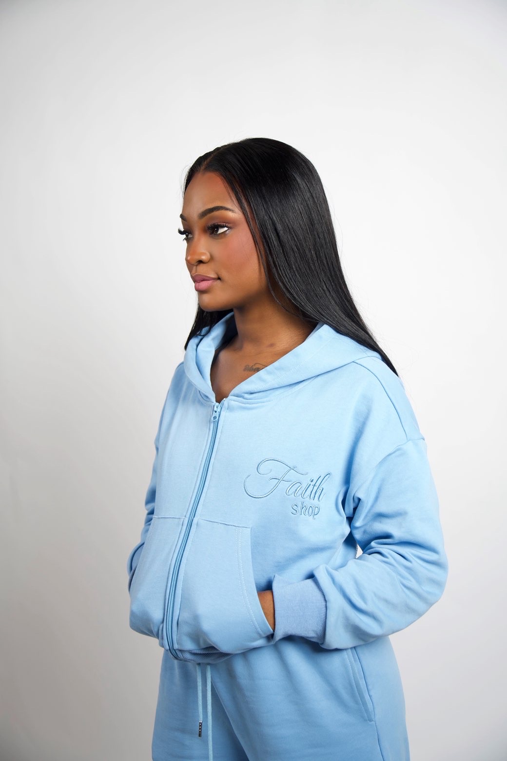 Ensemble conçu pour les « l’étoile brillante du matin » qui veulent allier foi, style et confiance. Sweat zippé à capuche avec broderie ton-sur-ton « Faith-shop » sur le pectoral. Pantalon Apocalypse : Coupe droite et moderne. Taille élastique avec cordon de serrage. Poches latérales. Inscription « Apocalypse 22:16 » en Strass. Convient pour un look casual, lifestyle ou street chic.