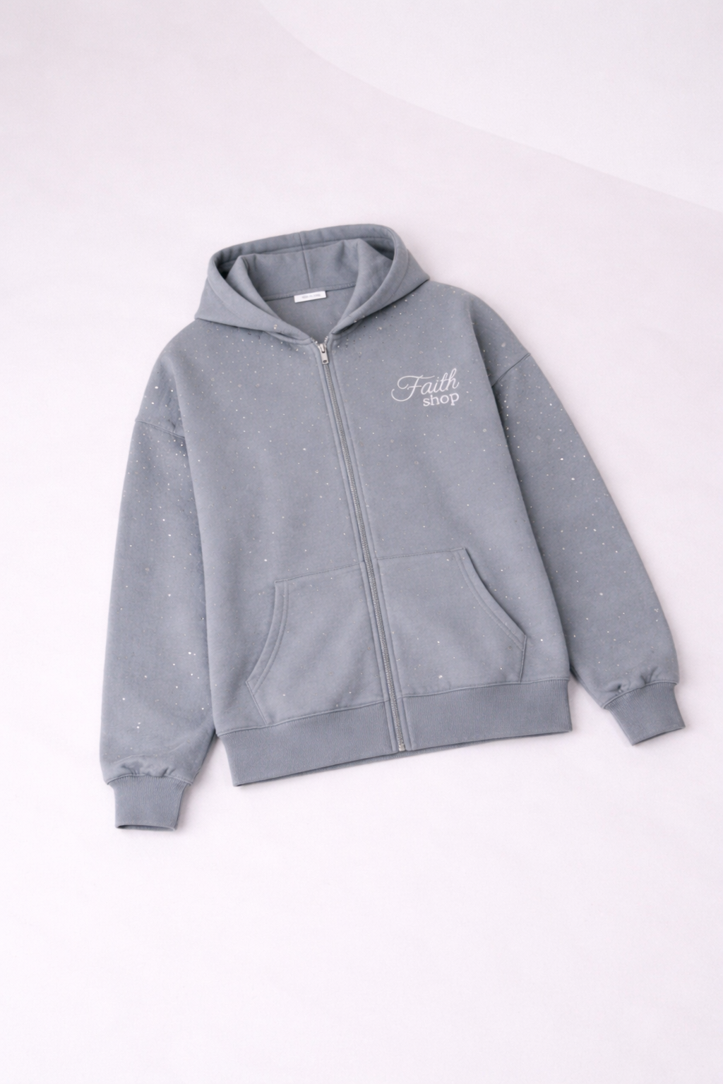 Le hoodie zippé Faith Shop allie confort, style et message. Une pièce moderne unisexe, pensée pour celles et ceux qui souhaitent porter leur foi avec élégance au quotidien. Idéal pour un look casual, confortable et stylé. Détails du produit • Sweat à capuche zippé unisexe • Couleur : Gris • Logo Faith Shop brodé sur la poitrine • Détails strass sur le tissu • Poches latérales • Coupe confortable • assorti avec le jogging Composition 100 % coton Tailles disponibles XS – S – M – L – XL – XXL Conseils d’entretien • Lavage à 30°C • Retourner le vêtement avant lavage • Séchage à l’air libre recommandé Pourquoi vous allez l’aimer ✔ Matière 100 % coton douce et respirante ✔ Coupe unisexe moderne ✔ Confort idéal pour le quotidien ✔ Un vêtement qui porte un message inspirant